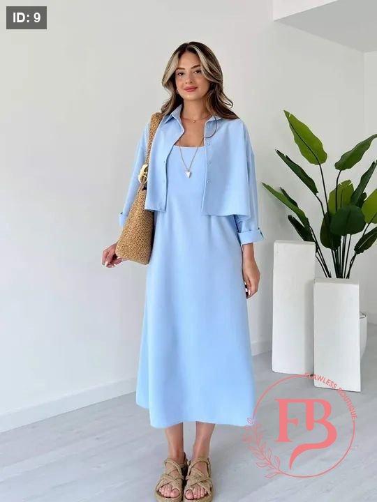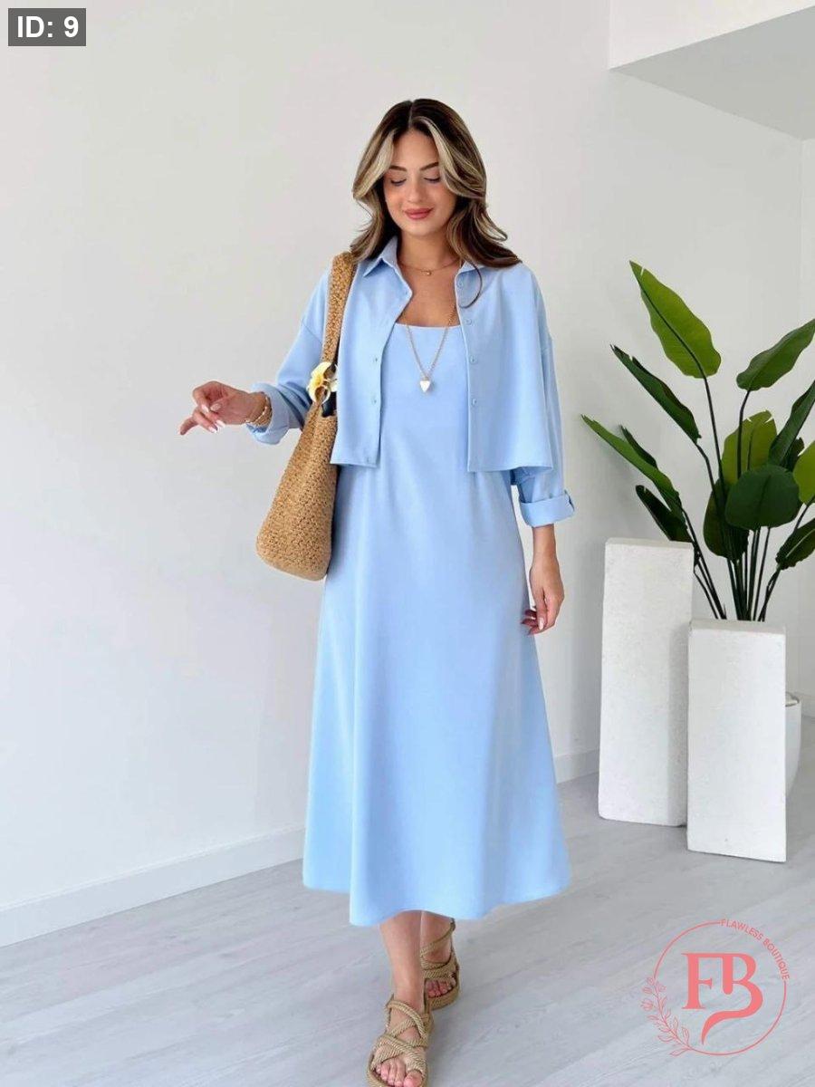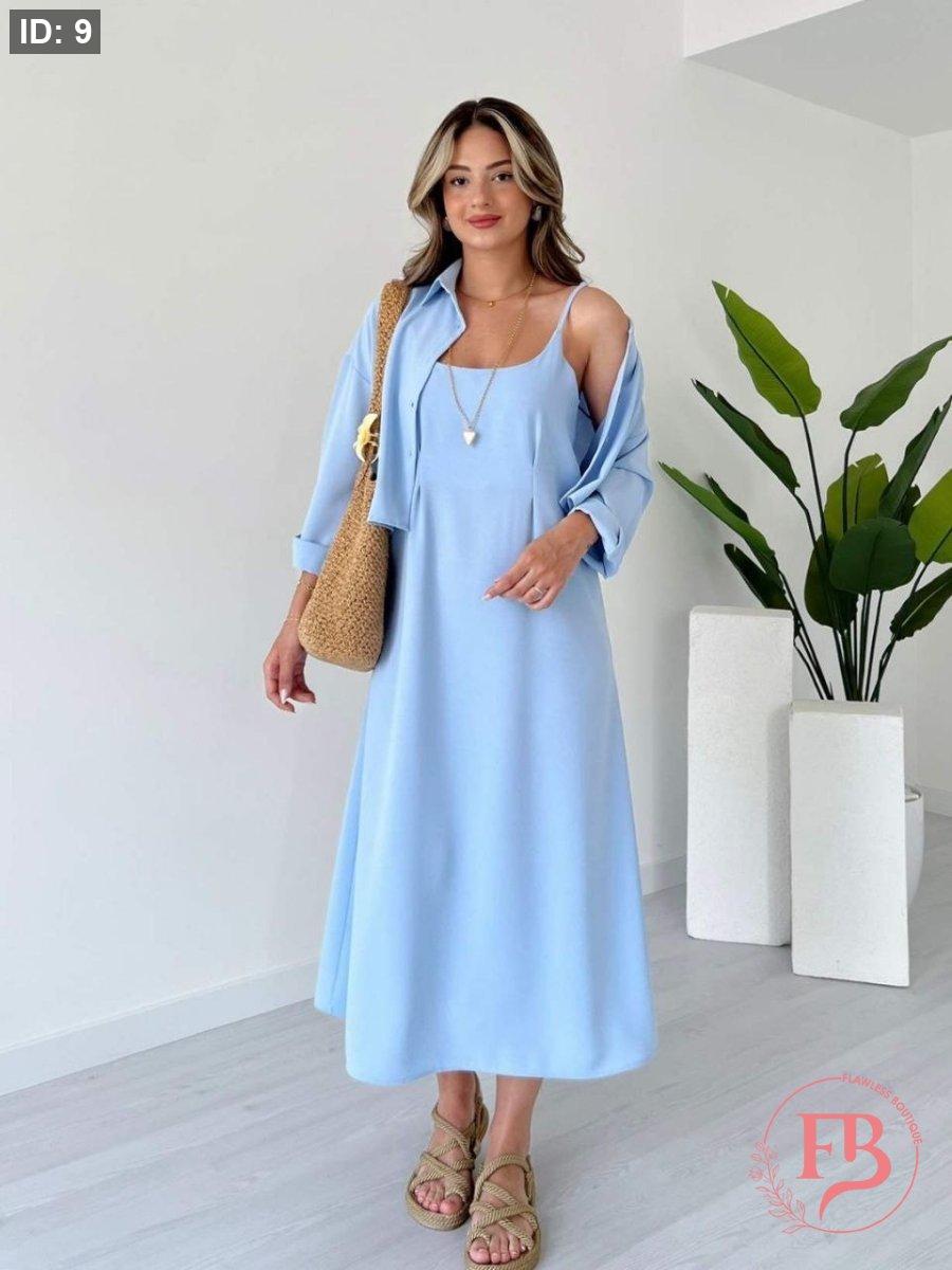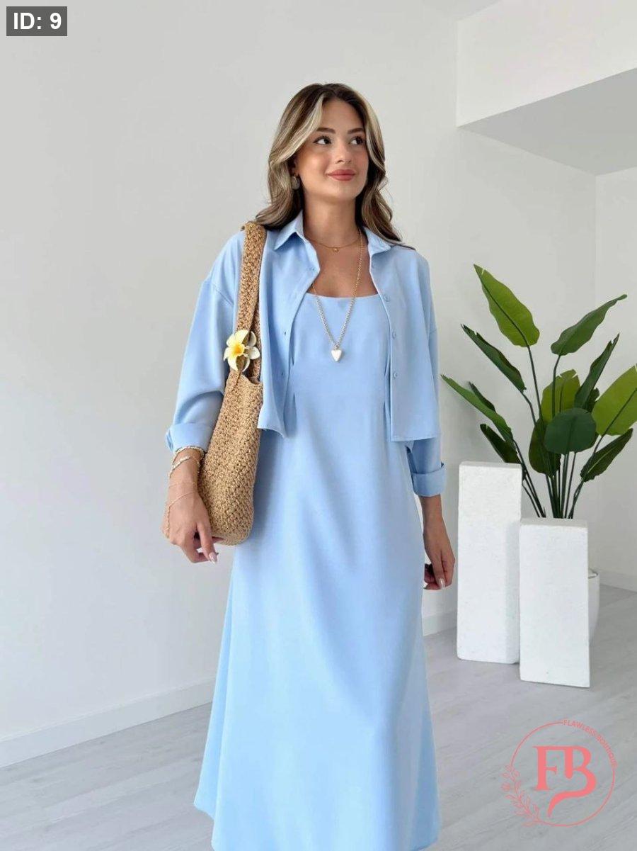 طقم فستان مع جكيت لون ازرق سماوي